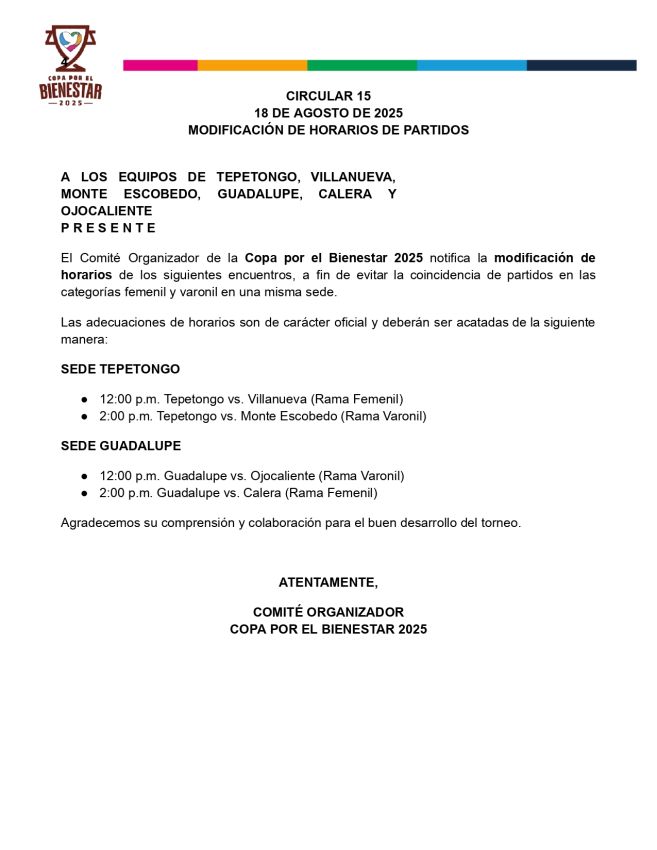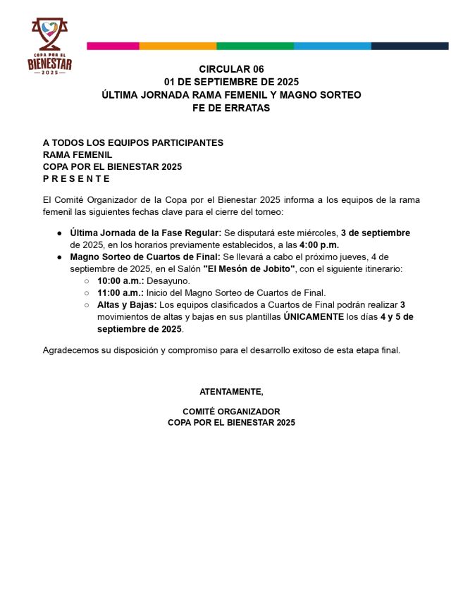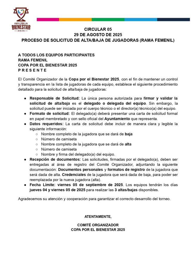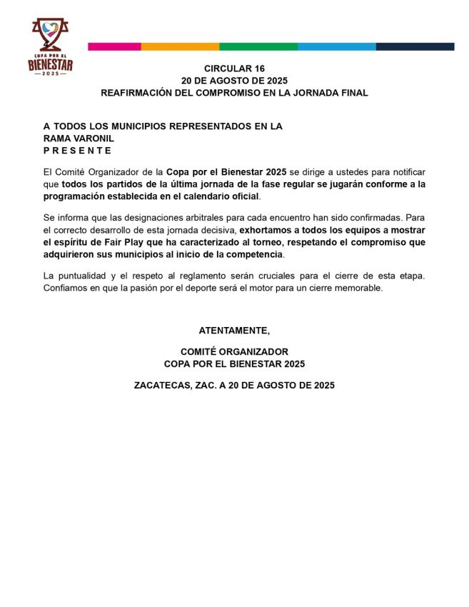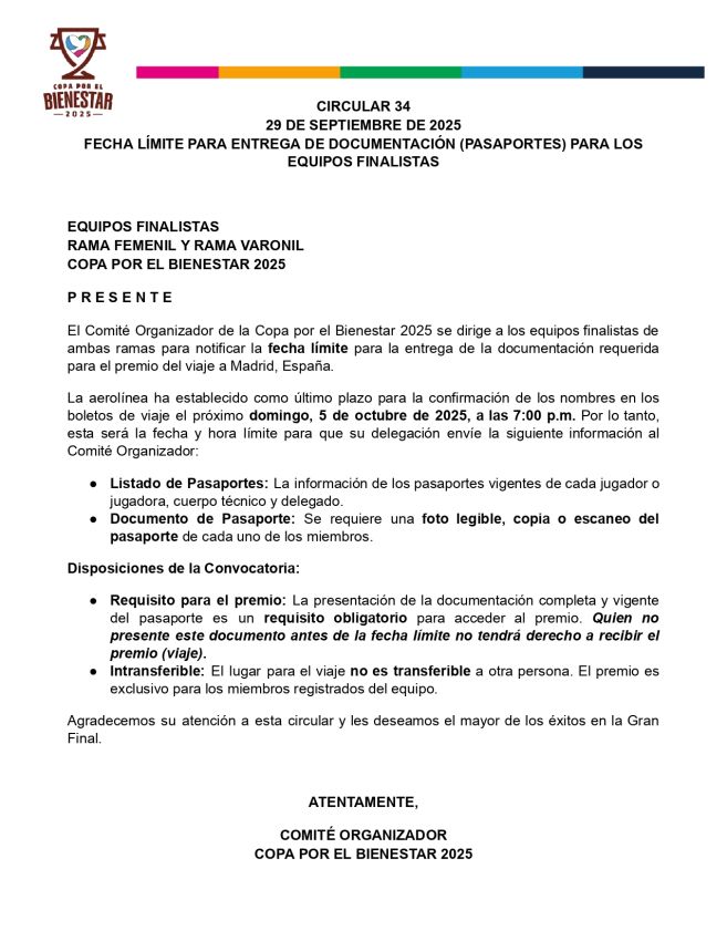 Recordatorio Importante: Tienen esta semana para entregar toda la documentación pendiente. Pueden hacerlo de dos formas: • Subir los documentos a la carpeta de Drive de su municipio. • Enviar los documentos directamente a este WhatsApp. ¡Es indispensable que incluyan la documentación completa de todos sus jugadores! Si eligen enviar por WhatsApp, nosotros nos encargaremos de subirla a su expediente. ⚠️ Fecha Límite Final para toda la documentación: 22 de junio ⚠️ Agradecemos su pronta atención y colaboración. Saludos